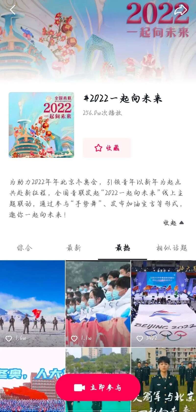 我们将陆续展出优秀视频,您也可以在抖音搜索#全国青联#或#2022,一起向未来#锁定精彩内容,为家乡点赞,也欢迎大家踊跃参与,舞出青春风采。