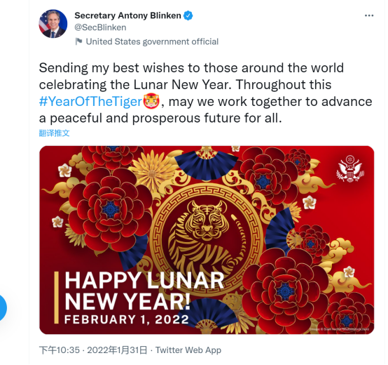 此外,布林肯当天还在个人推特上发布拜年推文,内容与新闻公报大致相同。↓