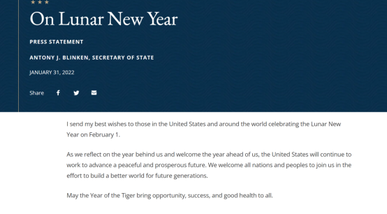 去年2月11日,布林肯也曾通过美国国务院官网发表的新闻公报,向世界各地的朋友拜年。其使用的措辞与今年的公报大同小异。