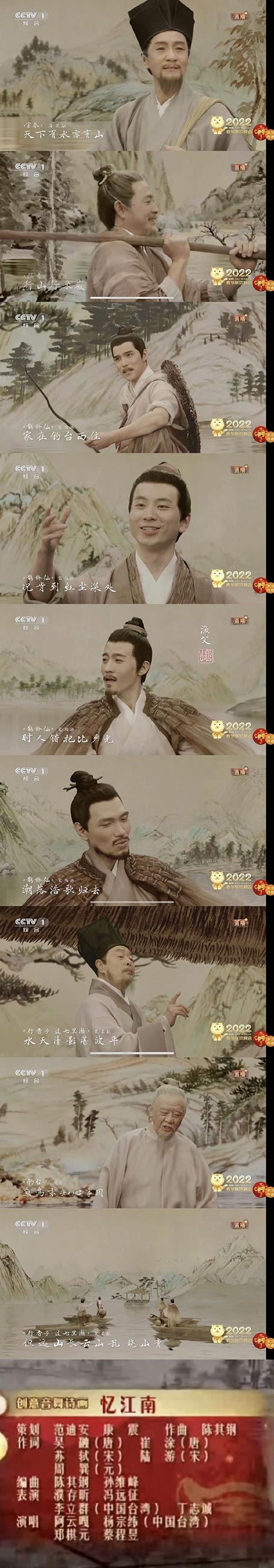 值得一提的是,央视春晚《忆江南》节目表演者中有两位中国台湾艺人,即李立群和杨宗纬。他们分别化身行者和渔夫,与其他六位中国大陆演员、歌手一道,在壬寅虎年演绎了一幅完整的“富春山居图”。
