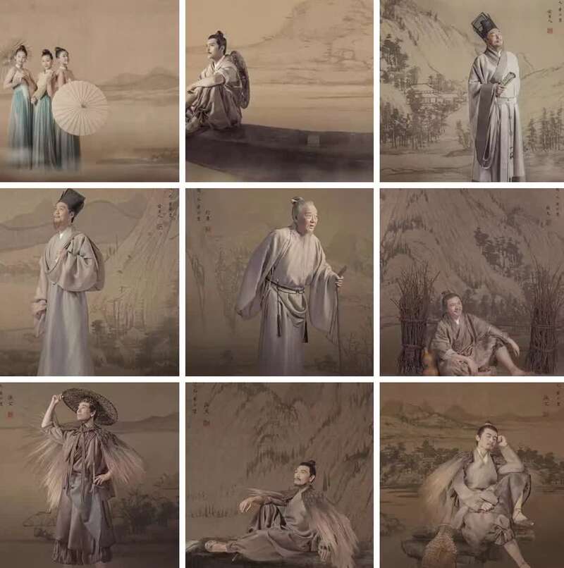 冯远征扮演的行者,吟诵着唐代吴融的《富春》出场,移步换景,行者离去,樵夫出场。丁志诚扮演的樵夫,吟诵着唐代诗人崔涂的《樵者》出场。精彩的朗诵加上草鞋木簪的扮相,给人带来视觉上的享受。接下来,由阿云嘎、蔡程昱、杨宗纬、郑棋元扮演的渔父自江上泛舟而来,他们用歌声演绎了陆游的《鹊桥仙》。画面由江上转到岸上,濮存昕扮演的读书人从亭中出场,吟诵着苏轼的《行香子·过七里濑》。之后,四位渔父又将下阙唱了一遍。