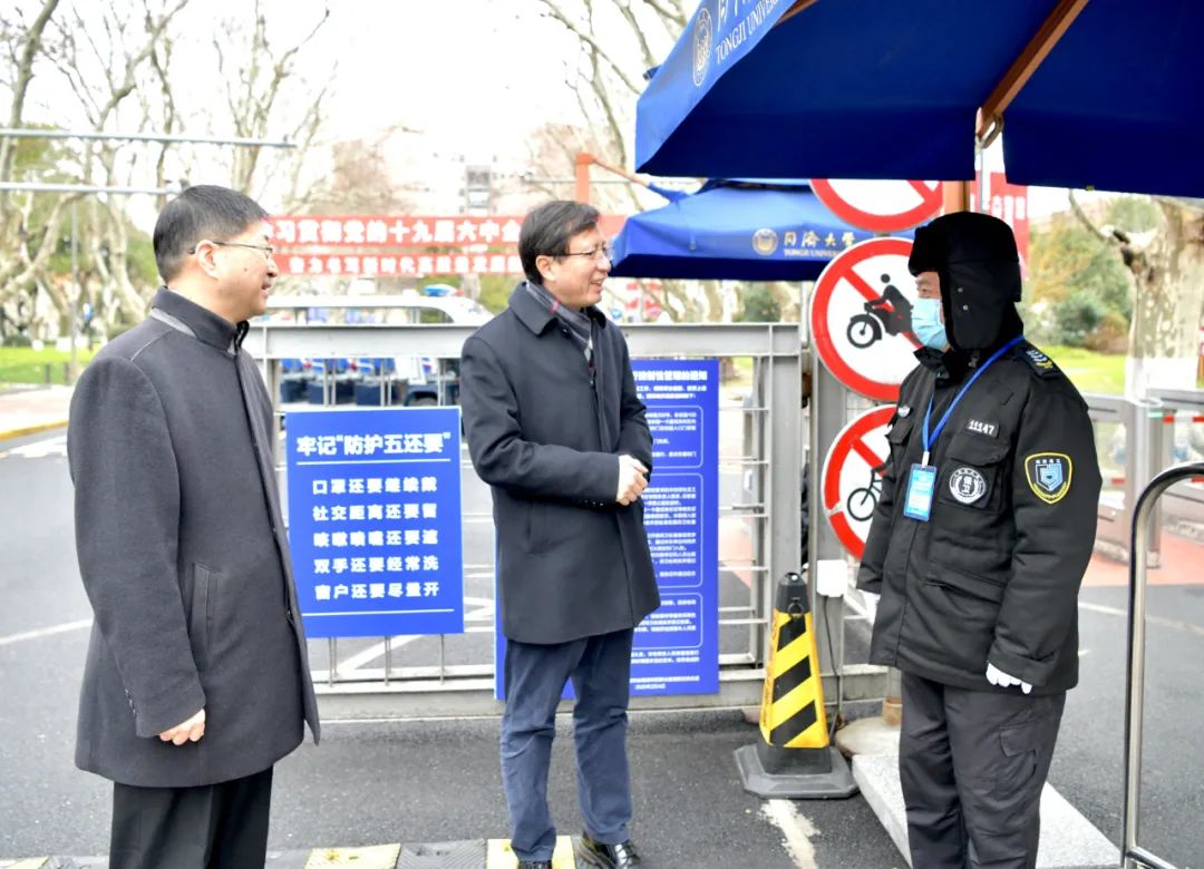 “感谢大家,各位辛苦了!”在春节来临之际,1月28日和29日,陈杰分别在四平路校区、嘉定校区和沪西校区检查寒假春节期间疫情防控和安全保障工作,先后走访了实验室、图书馆、学生社区、食堂、校门口,现场了解各单位寒假春节疫情防控和安全防范工作落实情况,与教师和学生亲切交谈,向在岗的工作人员表示亲切慰问,感谢他们的辛勤工作,希望各单位时刻绷紧安全这根弦不放松,坚决克服麻痹大意思想和侥幸心理,压实各方责任,毫不松懈筑牢校园安全防线,确保校园一方平安,用心用情为留校学生提供各项周到服务。