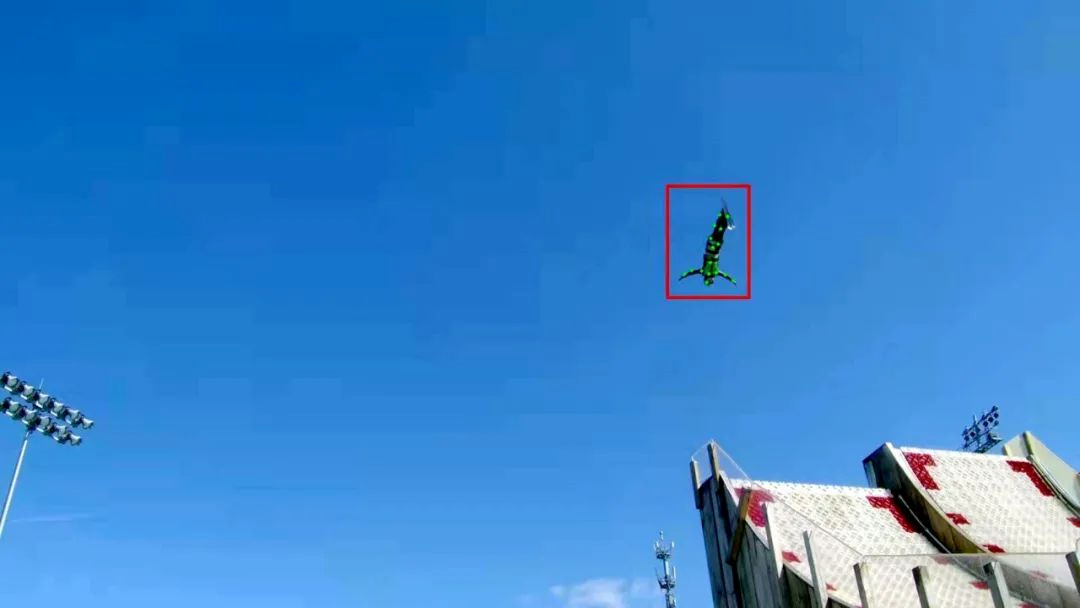 在该系统拍摄的自由式滑雪空中技巧国家队队员训练的视频中,滑行全过程,运动员的头、肩、腰、膝、手肘、脚踝等关键部位都会显示出绿色光标。杨连平介绍说:“视频都是由高速摄像机拍摄,这些绿色光标是人体的关键部位,通过光标之间距离的变化来测算人体翻转速度、角度等数据。”