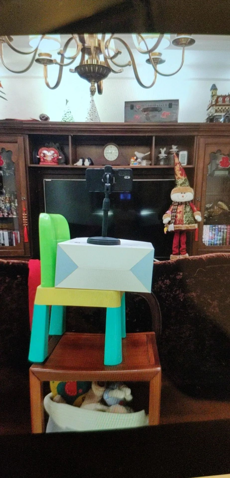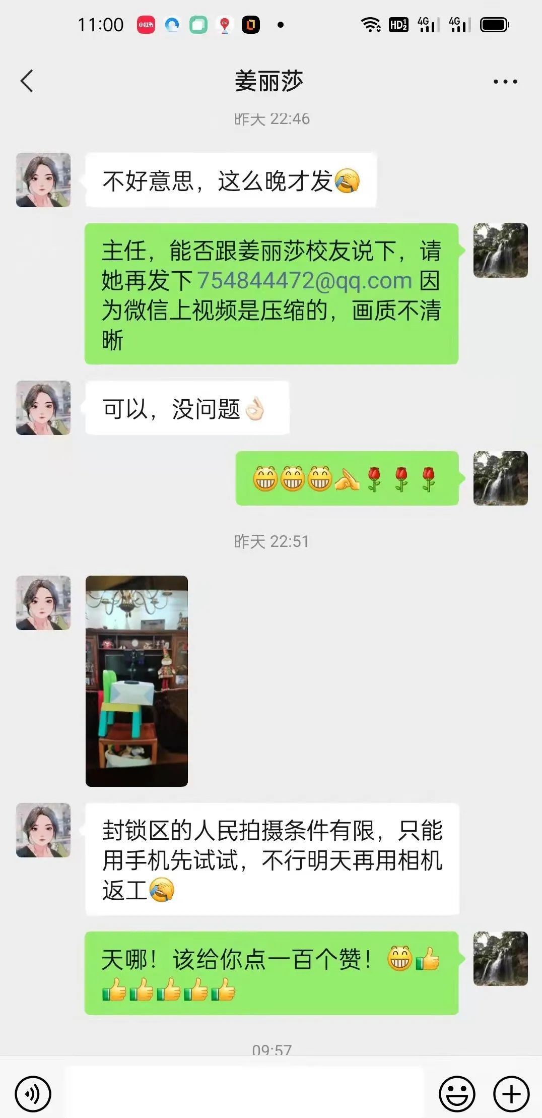 天津的校友姜丽莎正在担任社区疫情防控志愿者,下班回到家后,她巧妙地用两个小椅子、一个纸盒子和手机支架,迅速搭建好了简易的拍摄环境。