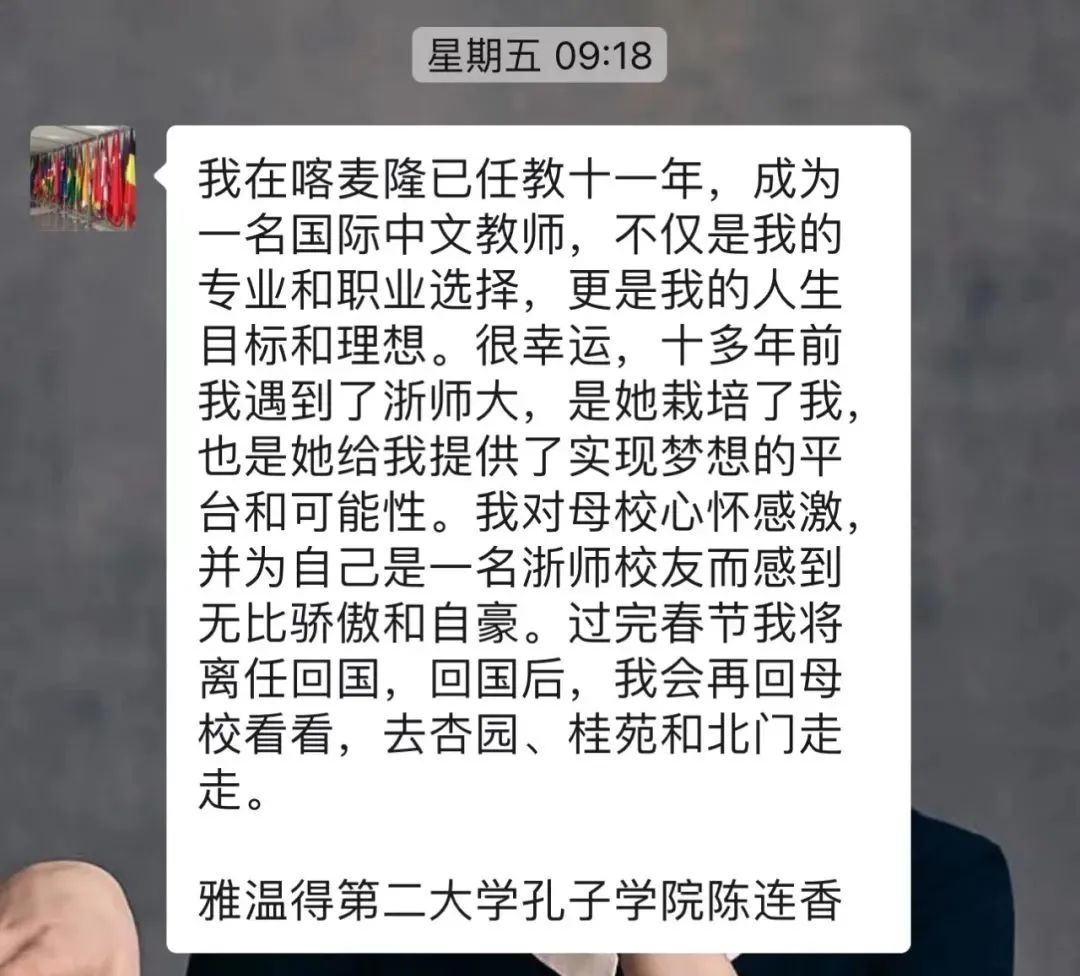 “很幸运,十多年前我遇到了浙师大,是她栽培了我,也是她给我提供了实现梦想的平台和可能性。我对母校心怀感激,并为自己是一名浙师校友而感到无比骄傲和自豪。” 陈连香说道。
