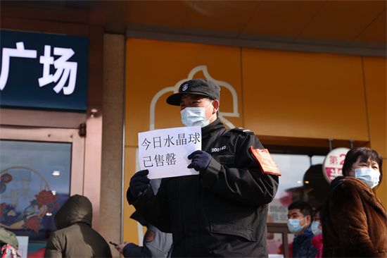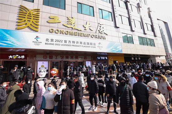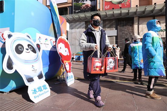 2022年2月5日,北京,“冰墩墩”“雪容融”等冬奥特许商品成春节热门礼物,在北京冬奥特许商品专卖店或大街上,随处可见购买的队伍和手里拎着吉祥物的市民及游客逛街。