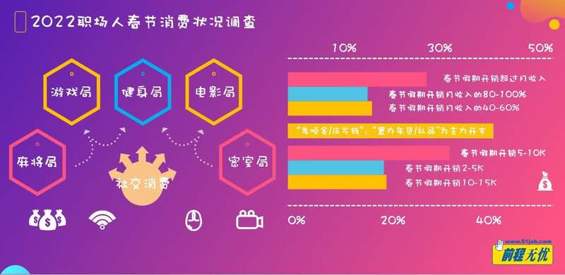 中国青年报客户端讯(中青报·中青网记者 孟佩佩)买年货、观影观展、滑雪旅游、看冬奥会……2022年春节消费,红红火火亮点纷呈。前程无忧近日发布《2022职场人春节消费调查报告》(以下简称“报告”)显示,近三成职场人春节假期的开销超过月收入,“孝顺金/压岁钱”“置办年货/礼品”是四成以上职场人的主力开支,职场年轻群体更重视“仪式感”,更愿意为“社交消费”买单。