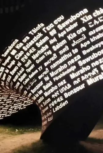 无论是西校区的世界语言博物馆、80周年校庆之际新落成的《永无止境》雕塑,还是广受好评的图书馆外墙设计,都完美体现了多语言的特点。 这些在北外校园里处处可见甚至已融入北外人血脉里的多语元素,如今在冬奥盛会的舞台上被赋予特殊的神圣感。 北外同款的多语元素不仅展现出日益强盛的中国对多元文化的欣赏与认可,也让每一位北外人进一步深知“融通世界”的崇高使命感,让北外人对“兼容并蓄、博学笃行”的精神也将有更深切的体悟与更坚定的追求。每一种语言,都承载着我们想要沟通中国与世界、促进多元文化交流融合的美好愿景。