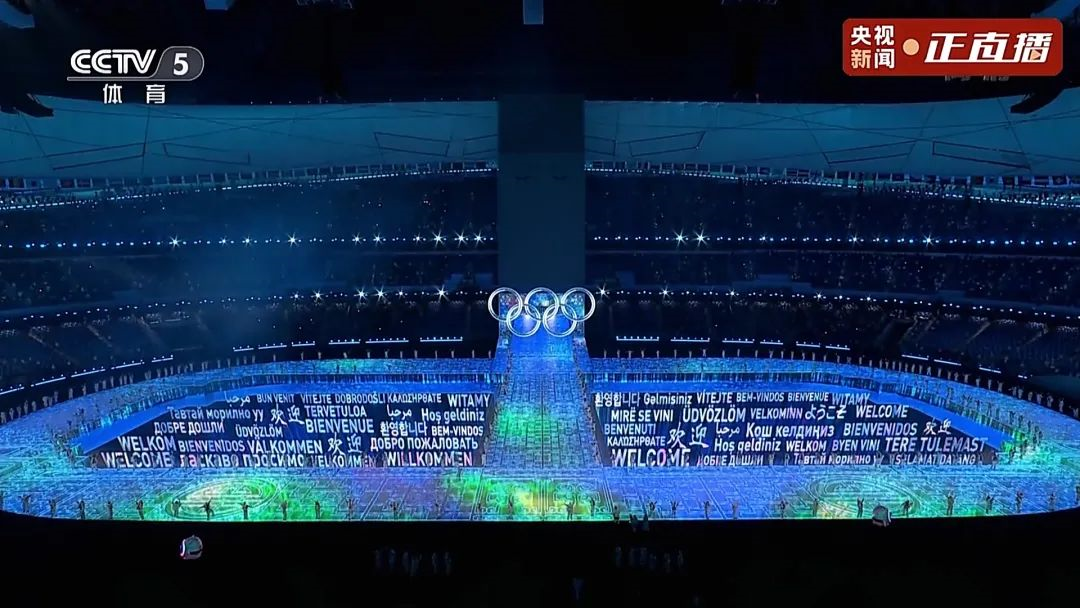 当从“冰立方”中雕刻出的晶莹剔透的“冰雪五环”缓缓上升,所有人都为之欢呼。这个被定义为“破冰”的环节,寓意着“打破隔阂、化解矛盾、走近对方、互相理解”。多语种的“欢迎”字样随后出现在“鸟巢”中央,展示着北京对全世界各国运动员的热情欢迎。每一种语言的地道表达不仅传递着北京作为“双奥之城”的办赛热情,更代表着中国人民对世界来宾最真切的致意。