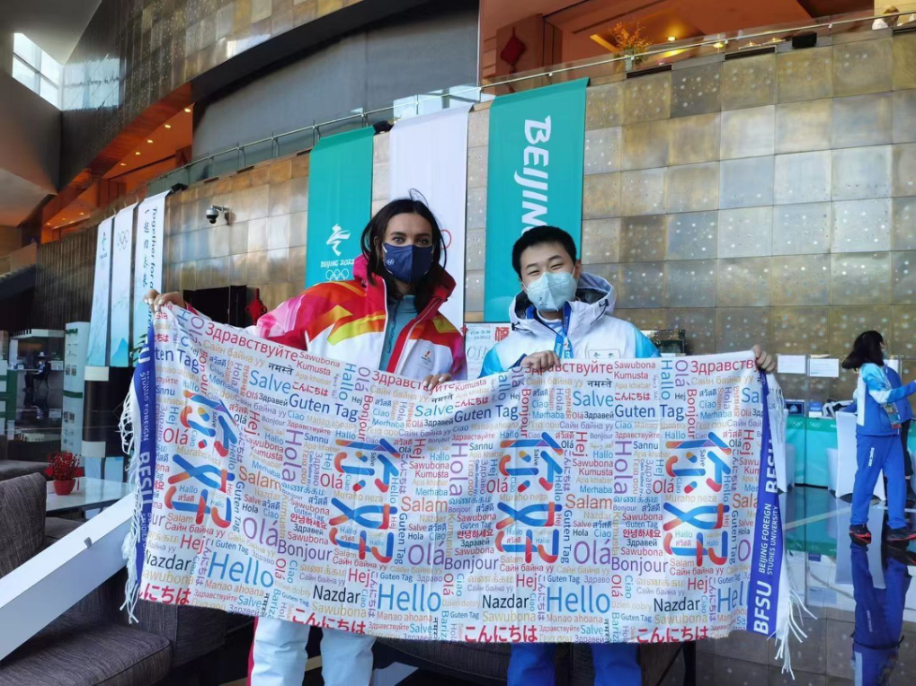 北外派出的900余名专业志愿者中,有204名OFA志愿者服务于国际奥委会各要职部门主要负责人及各国家(地区)奥委会主席、秘书长,234名志愿者在北京、延庆及张家口冬奥村服务于来自各个国家和地区的运动员代表团。为彰显构建人类命运共同体的价值理念,传递友谊长久、团结一致的奥林匹克精神, 北外志愿者们为外方代表赠送“你好”系列多语种围巾,在寒冷冬日送上温暖守护的同时,也希望他们把来自北外、来自中国的祝福带回世界各地。