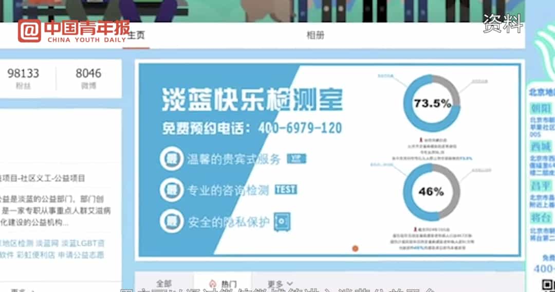 这家机构在全国22个城市有线下检测室,其中北京有四家。用户可以通过微信、微博等进入淡蓝公益平台,找到身边最近的HIV检测服务点。淡蓝公益可以为来访者提供一对一的匿名检测咨询服务,相关信息会受到严格的保密。