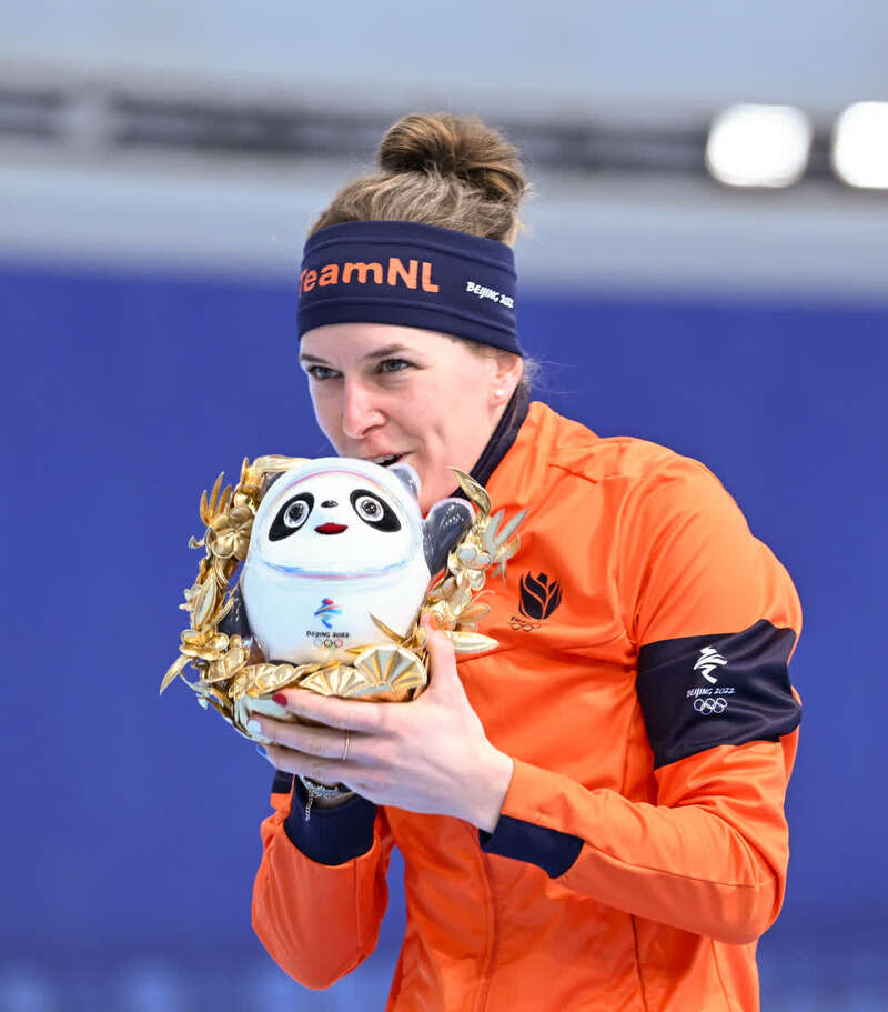 ↑2月7日,速度滑冰女子1500米冠军、荷兰选手伊琳·维斯特在颁发纪念品仪式上亲吻金色冰墩墩。