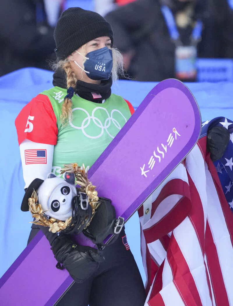 ↑2月9日,单板滑雪女子障碍追逐赛冠军、美国选手琳赛·雅各贝利斯在颁发纪念品仪式上高举金色冰墩墩。