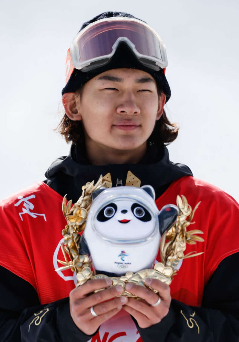 ↑单板滑雪项目男子坡面障碍技巧亚军、中国选手苏翊鸣在颁发纪念品仪式上手捧金色冰墩墩。