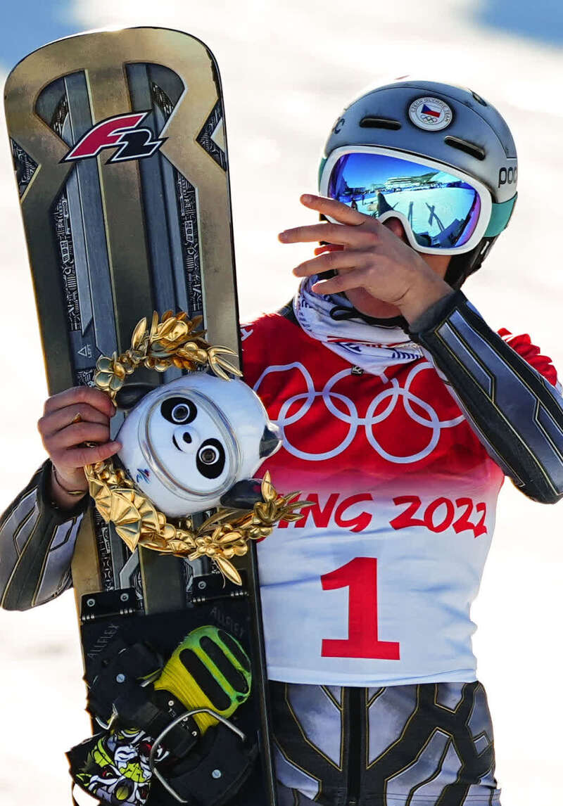 ↑2月8日,单板滑雪女子平行大回转冠军、捷克选手埃斯丝特·莱德次卡在颁发纪念品仪式上。