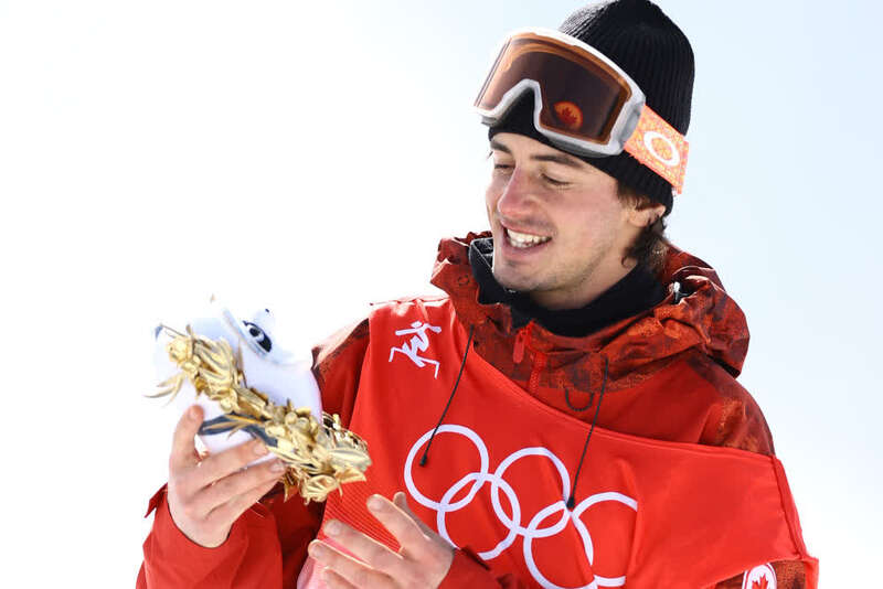 ↑2月7日,单板滑雪男子坡面障碍技巧季军、加拿大选手马克·麦克莫里斯在颁发纪念品仪式上端详金色冰墩墩。