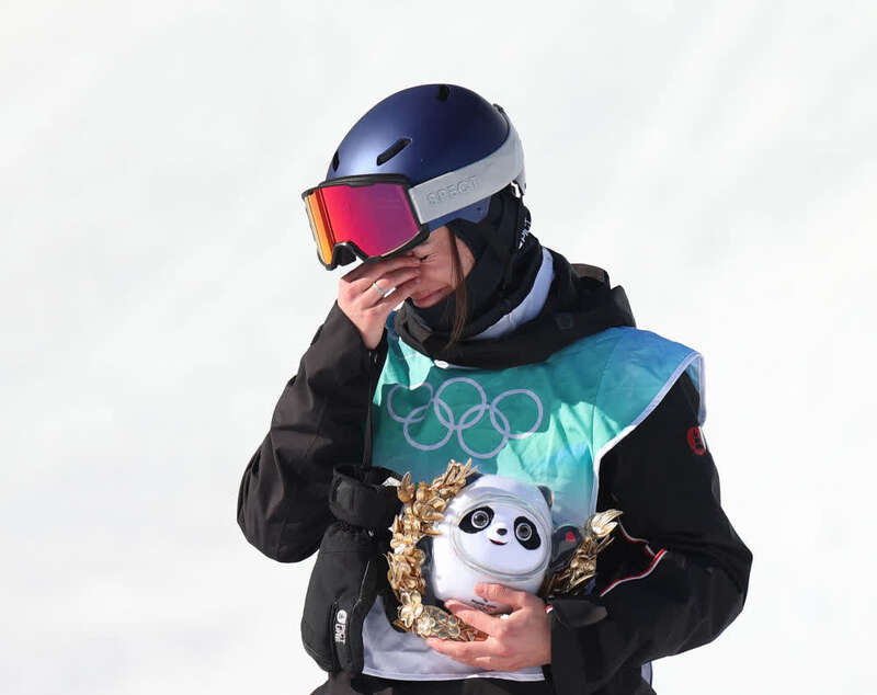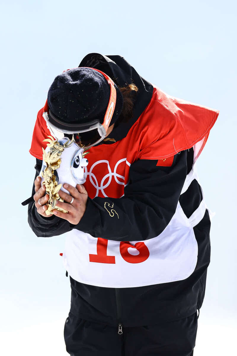 ↑2月8日,自由式滑雪女子大跳台冠军、中国选手谷爱凌在颁发纪念品仪式上高举金色冰墩墩。