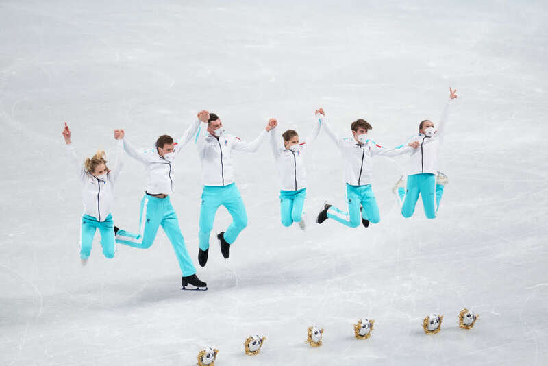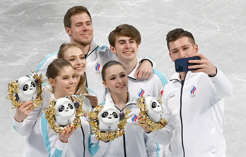 ↑2月7日, 花样滑冰团体赛冠军、俄罗斯奥委会队选手在颁发礼品仪式上与金色冰墩墩合影。