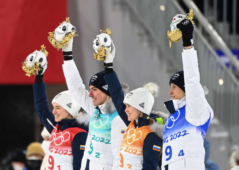 ↑2月7日,跳台滑雪混合团体赛冠军、斯洛文尼亚队选手在颁发纪念品仪式上集体高举金色冰墩墩。