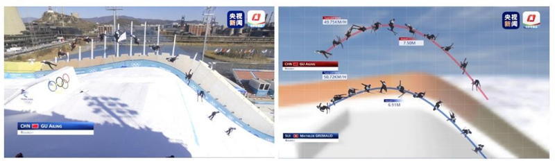 在滑雪大跳台的8K节目制作中,总台的“时间切片”系统可以逐帧抓取运动员从起跳到落地之间的空中姿态,运动员起跳后18秒内,就可用数据和图形将他的运动表现分析呈现给观众。
