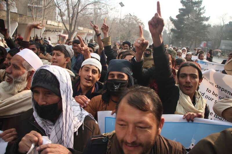 1月2日,阿富汗人在喀布尔街头参加抗议活动。当天,数千民众在喀布尔抗议美国冻结阿富汗海外资产。新华社发(塞夫拉赫曼·萨菲摄)