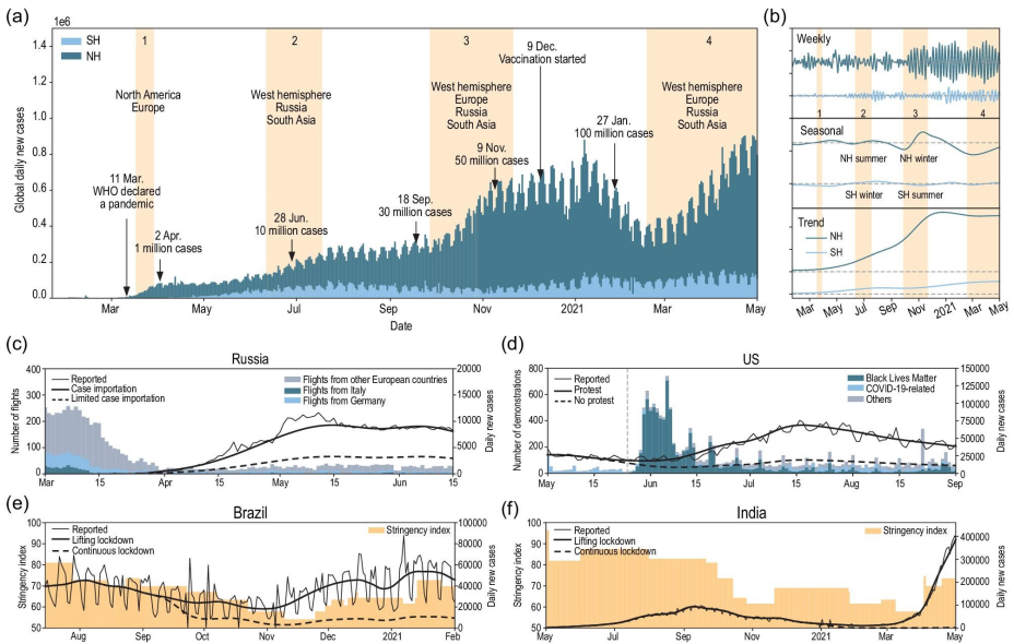 经过一次又一次的尝试、模拟、验证,他所建立的模型终于完整重现出过去一年全球疫情的发展。模型结果表明,季节变化能在一定程度上确实能影响疫情的发展,但其影响的程度不足以让疫情在没有管控措施的情况下得到控制。