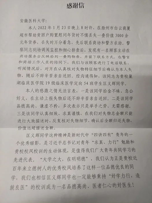 感谢信中,张女士高度赞扬了安徽医科大学教书育人的成果,并向匡义辉同学送上了美好的祝愿:“我们认为正是贵校近百年来立德树人的优秀校风,培养了这样一位品德优良的同学。我们也相信匡义辉同学一定能够秉持‘好学力行,造就良医’的校训,成为一名品德高尚、医者仁心的好医生!”