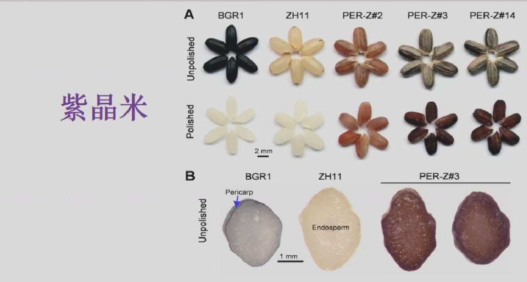 “好看吧?它们叫作‘紫晶米’和‘赤晶米’”,看到记者对着玻璃器皿里深紫色和胡萝卜色的大米反复端详,生命科学学院院长陈乐天主动做起了讲解员,“这种大米可不单单是好看,营养价值还很高,富含对人体有益的花青素和虾青素,是我们利用基因工程技术培育出的水稻新种质。”