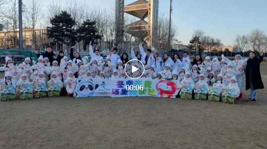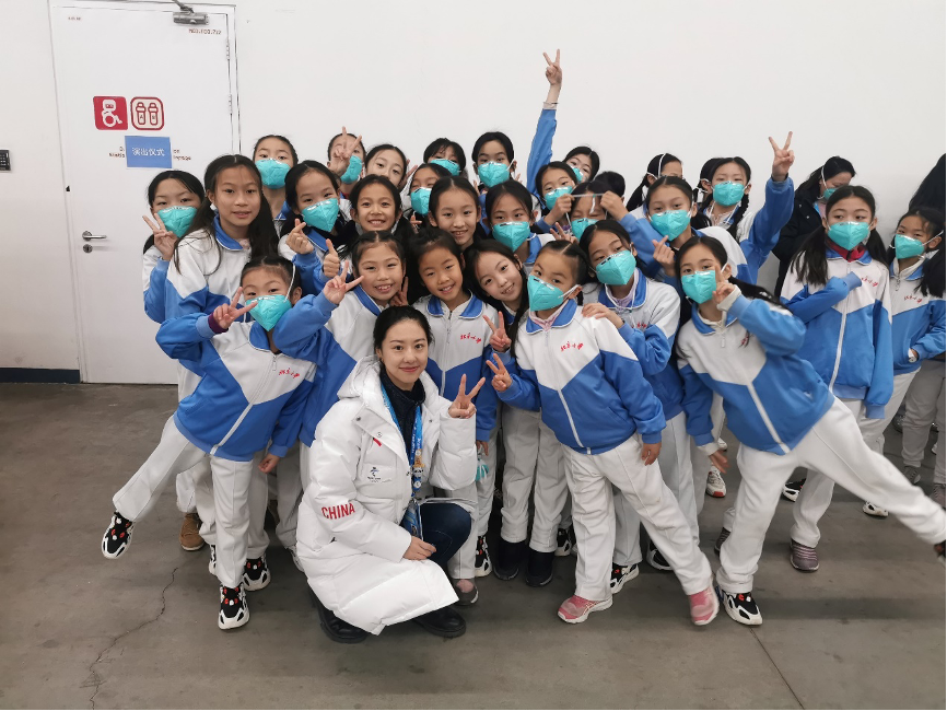 田晴与放飞和平鸽的小演员们为冬奥喝彩