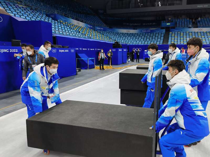 转场工作是赛前准备的重要一环。他们在比赛结束后第一个进场,仅有20分钟时间完成工作,“延迟一分钟,便会影响后面冰面修整的工作效率”。