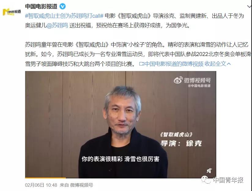 苏翊鸣的精彩表现被网友称为“横跨CCTV6和CCTV5的男子”,因为在运动员身份之余,他还是一名演员,在徐克执导的电影《智取威虎山》中,“小栓子”的扮演者正是10岁的苏翊鸣。他同时还参演过《狼殿下》《林海雪原》《摇滚小子》等影视作品。
