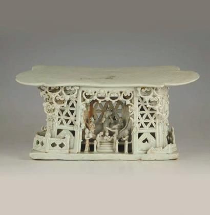 宋、元之间的瓷枕除之前谈到的几类以外,还有一种极为精美,造型非常独特,并引人入胜的类别。此类瓷枕便是人物楼台式瓷枕,其中最经典的或许是1981年安徽岳西县出土的一件,元代青白釉建筑人物瓷枕,曾入选《中国文物精华》(1984)。
