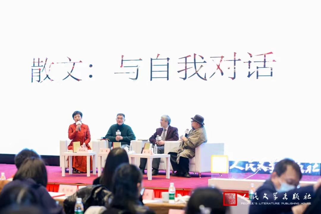 著名散文家刘亮程的文学课开启了“散文:与自我对话”环节。在散文领域笔耕不辍的刘亮程,认为“散文是最大众的文体”,是 “我们日常表达的一种方式”,因而一直是国内语文教育的重要内容,这种”从大地家乡出发,朝天飞翔”的叙述方式在自媒体时代传播最广。刘亮程提出的散文是“绝处逢生”令人印象深刻。北京大学教授赵白生、作家止庵、北京作家协会副主席周晓枫,分享了自己最喜欢的散文作家和散文经典,引用了蒙田、培根、梭罗、茨威格等散文名家的金句。2月22日,是哲学家叔本华的诞辰纪念日,也是作家茨威格的逝世纪念日。因此活动现场以两段视频向两位为人类留下深邃名言的散文家表达致敬。这一环节在三段优美的散文选段朗诵中结束。周晓枫朗读的茨威格《人类群星闪耀时》,止庵朗读的萨特《文字生涯》,赵白生用英文朗读的梭罗《瓦尔登湖》,以美丽而智慧的语句应和着刘亮程的结论:“散文是我们平庸散碎生活的庄重仪式”。