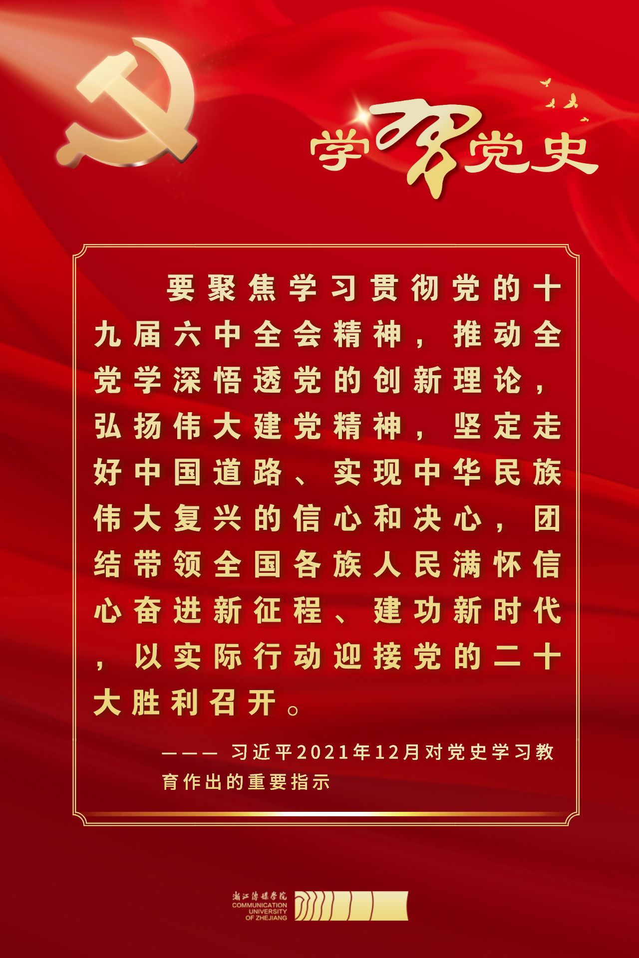 百年恰是风华茂,学习党史正当时。为庆祝中国共产党成立100周年,深入开展党史学习教育,官微推出"学习党史"专栏,通过学习习近平总书记关于中国共产党历史的系列重要论述,引导浙传师生做到学史明理、学史增信、学史崇德、学史力行,学党史、悟思想、办实事、开新局,进一步凝心聚力、开拓创新,为建设国内一流、国际知名高水平传媒大学不懈奋斗。