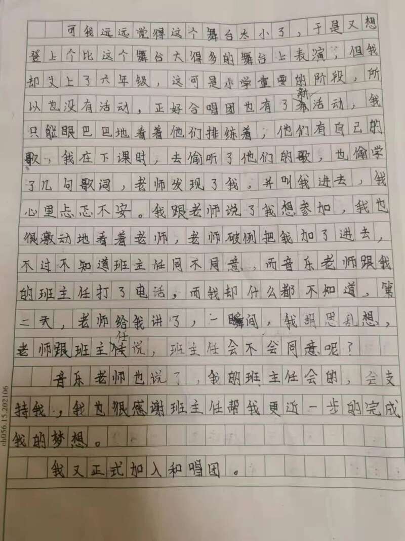6岁就开始用爸妈手机里的音乐软件听歌学歌的他,一直有个音乐梦。但此前的音乐课上老师只带唱,不教节拍和旋律,还经常被主科占用。一到课间他就躲起来唱歌,给自己打响指找拍子。上了五年级,连音乐课都被取消了,他更觉得自己的热爱无施展之地。