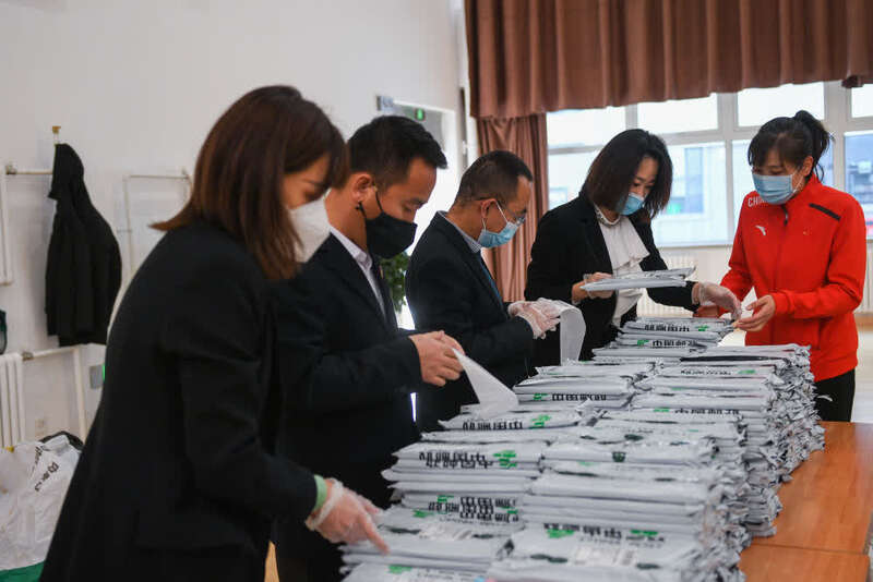 2月28日,在呼和浩特市赛罕区南门外小学,教职工给教材包裹粘贴快递单号。(新华社记者刘磊摄)