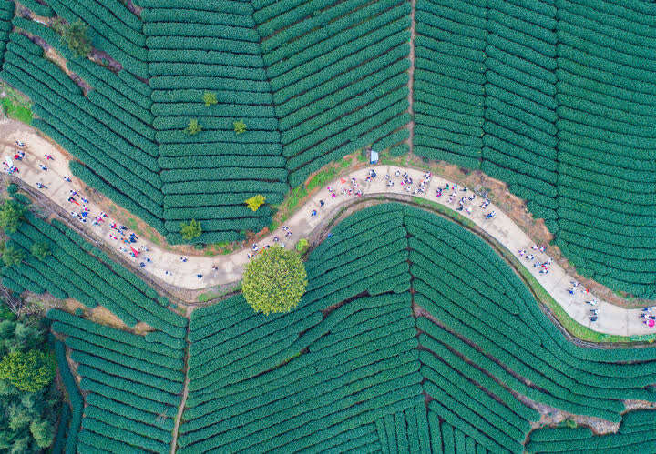 团队游客在杭州市富阳区拔山村万亩茶山游览(2018年3月26日摄,无人机照片)。浙江省“千村示范、万村整治”工程撬动了乡村从美丽生态到美丽经济,再到美好生活的良性循环。2018年,浙江“千万工程”获得联合国“地球卫士奖”中的“激励与行动奖”。新华社记者 徐昱 摄