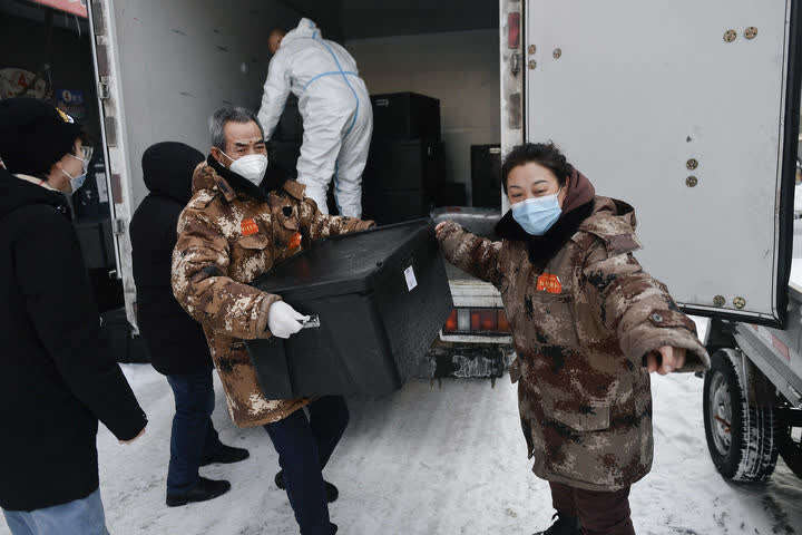赵淑华(右一)指挥社区工作人员和志愿者搬运盒饭(2021年2月15日摄)。赵淑华是吉林省通化市东昌区团结街道文化社区副主任、网格长,临近退休的她毫不犹豫投身抗疫一线。新华社记者 许畅 摄