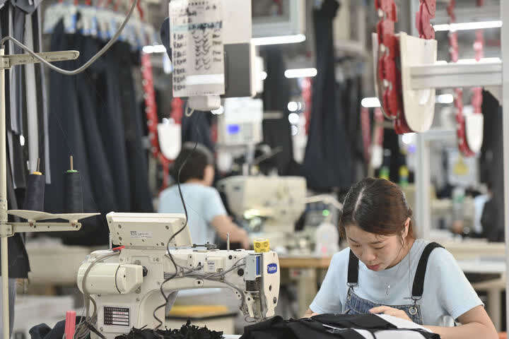 在位于福建省泉州市经济技术开发区的九牧王西裤智能化生产车间,工人在自动化西裤吊挂流水线上作业(2021年7月30日摄)。近年来,泉州市税务部门积极落实减税降费,出台一系列稳定工业、扶持外贸、鼓励企业研发创新的政策,服务实体经济发展。新华社记者 宋为伟 摄
