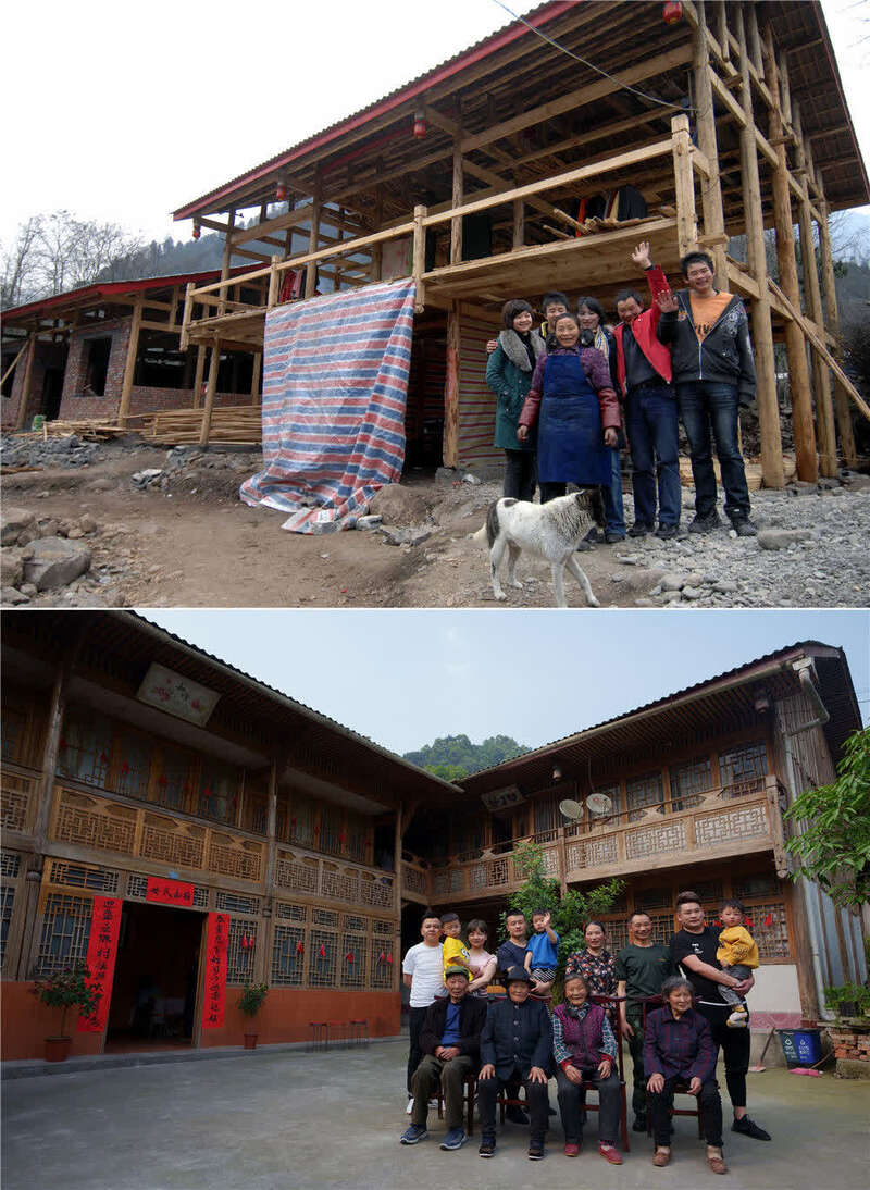 这是一张拼版照片,上图为四川省绵阳市安州区高川乡茅香村群众林兴聪(右二)、李芸香(右三)和家中的老人、孩子在重建中的住房前留影(2009年1月25日,新华社记者江毅摄);下图为林兴聪(后右三)、李芸香(后右四)一大家13口人在房前留影(2021年5月4日,新华社记者江宏景摄)。新华社发