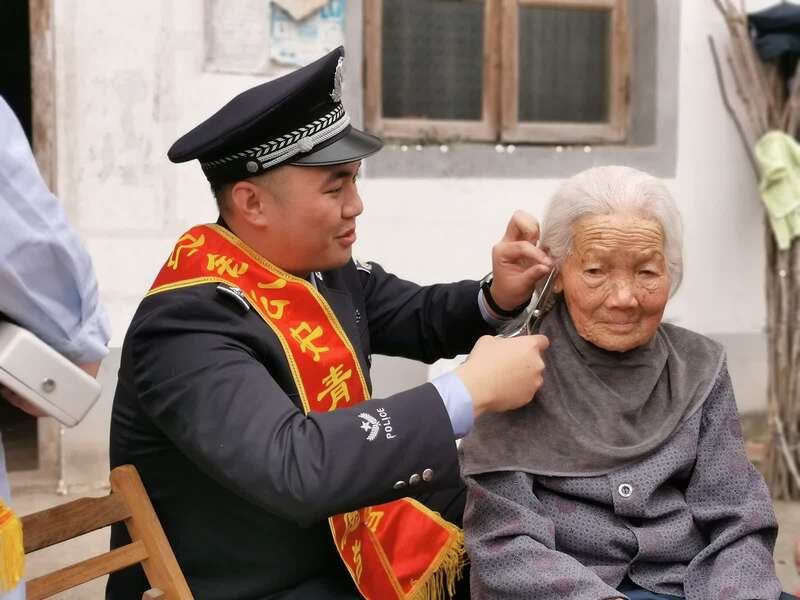 3月4日是农历二月二“龙抬头”,民警秦勇给黄爱明老人修剪头发。 喻恋涵/摄