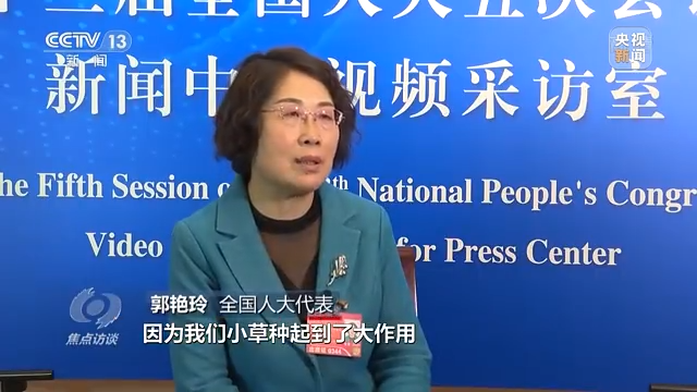 全国人大代表 郭艳玲:给总书记作了一些汇报,我们小草种起到了大作用,草原综合植被盖度提高到45%。去年,我们草原上第一次看到了雪豹的身影,草种质资源在草原生态保护、修复过程中再作贡献。