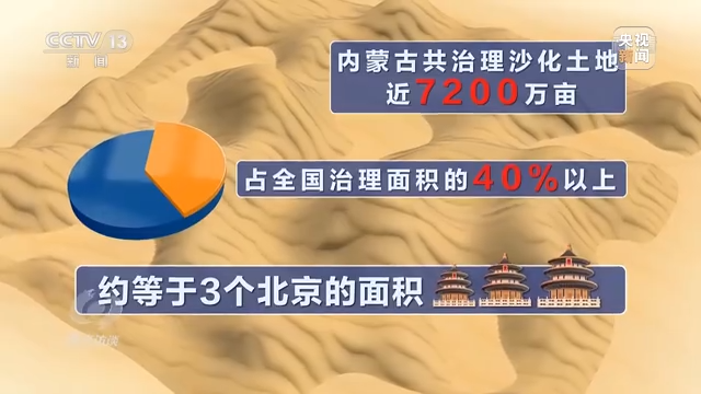说到内蒙古的生态治理,来看一组数据:内蒙古这几年治了多少沙?以库布齐沙漠为例,过去,由于过度放牧和开荒耕作,这里,曾经沙尘肆虐,寸草不生。年平均降雨量不足150毫米,蒸发量是降雨量的20倍。经过多年治理,截至2021年,库布齐沙漠已完成修复治理900多万亩,植被覆盖度由20世纪80年代不足3%提升到53%。2016—2020年,内蒙古共治理沙化土地近7200万亩,占全国治理面积的40%以上,约等于3个北京的面积。