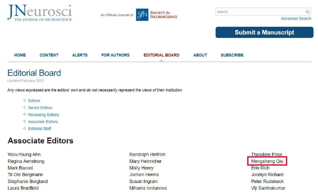 近日,我校邱猛生教授应邀担任国际知名学术期刊Journal of Neuroscience副主编(Associate Editor)。Journal of Neuroscience创刊于1981年,是美国神经科学学会(SfN)旗舰期刊,神经科学领域的TOP期刊之一,属于中科院JCR期刊分区一区。Journal of Neuroscience主要发表神经科学领域的前沿研究,包括行为/认知、细胞/分子、发育/可塑性/修复、疾病的神经生物学、系统/电路等。该杂志重视反映无偏见和可重复的实验、方法、程序、分析和报告的科学研究,以推进神经科学领域发展。邱猛生教授担任Journal of Neuroscience期刊副主编,成为该刊创刊以来担任副主编中为数不多的中国大陆学者。