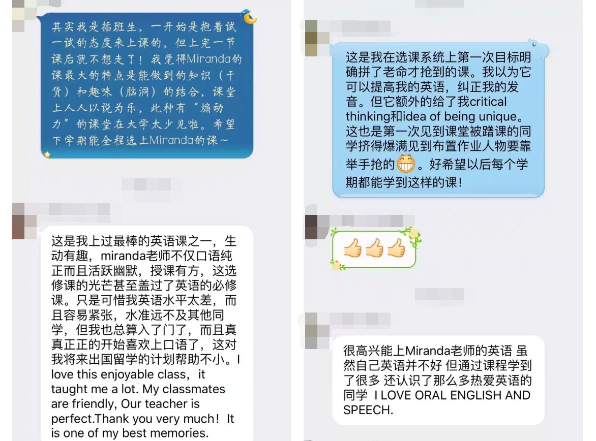 现如今,《英语口语与演讲》课程每学期面向全校开设至少五个班级,各个年级、各个专业的学生带着自己的兴趣走入课堂,带着满满的知识收获、无限的能力提升,自信地走向下一段旅程。