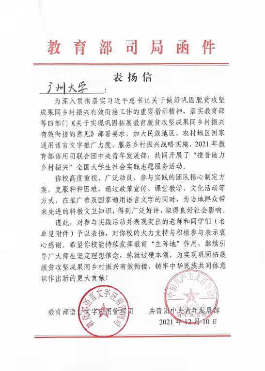 看到推普队伍们取得的好成绩,人文学院陈楚敏老师说,“星火燎原推普行动队”是在我校和我院的大力支持与鼓励下组建的团队,主要成员都是我院的师范生,部分队员刚刚从“挑战杯”省赛比完赛就马上投入到这次推普实践服务活动了,同学们都表现出高度的团队合作精神、较为扎实的中文专业素养,以语言的力量走进社区、走近村民、走向同音,传递广大青年正能量。今后希望更多同学能一同参与到语言志愿服务中来,继续讲好中国话、写好中国字、做建设新时代的中国好青年!