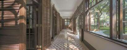 上世纪30年代,“颜料大王”周宗良买下此地,并于1936年委托华盖建筑师事务所新建了客厅楼和子女楼,最终形成我们今天看到的花园为主、建筑为辅的格局。上世纪30年代中后期,现代主义建筑风潮刮到了中国,逐渐在上海流行,中外建筑师也都在尝试采用这种新的风格,如邬达克1935年设计的铜仁路“绿房子”等。华盖建筑师事务所是比较倾向于现代主义设计风格的华人建筑师事务所。在此次的扩建中,设计师充分运用了现代主义风格的理念,力求使建筑功能合理,风格新颖,体现时代特点。新建的客厅楼,位置靠近院落主出入口,脱离生活区,功能与流线可独立对外,并与原主楼和管家楼围合,形成入口小院。该楼的建筑立面强调水平向线条,朝向花园采用大面积玻璃钢窗,向外延伸的室外露台淡化了室内外界限。压纹釉面砖、白绿相间的马赛克等也是当时流行的新材料,极具时代感。室内热水汀暖气片的运用,折射出当时暖通技术的先进。地板采用双层设计,下面有防水隔热层,上面则是长条形的柳桉木地板,六块地板铺成一个正方形,所有的正方形拼起来,又有一种竹席的质感,这或许是主人对中式味道的追求。另一栋新建的子女楼则为两层砖木结构,通过连廊与早年建成的主楼(父母楼)相连,为避免遮挡主楼东立面的采光,建筑选址于主楼东北。在建筑形态上虽与主楼相近,装饰细部和材料应用上却有所变化,外墙和主楼一样采用拉毛粉刷,但无卵石饰面,带有简化的装饰艺术风格特点。子女楼从选址到选材,均考虑烘托主楼地位,低调谦和。
