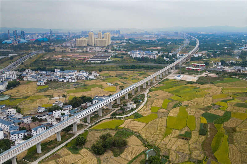 联调联试列车经过信丰特大桥(2021年10月14日摄,无人机照片)。2021年12月10日上午,连通赣南革命老区与深圳经济特区的赣深高铁正式开通运营。新华社发(张海根 摄)