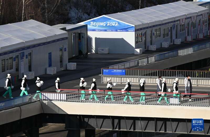 参与表演的学生在老师带领下进入国家冬季两项中心,准备开始当天正式演出前的彩排(3月8日摄)。