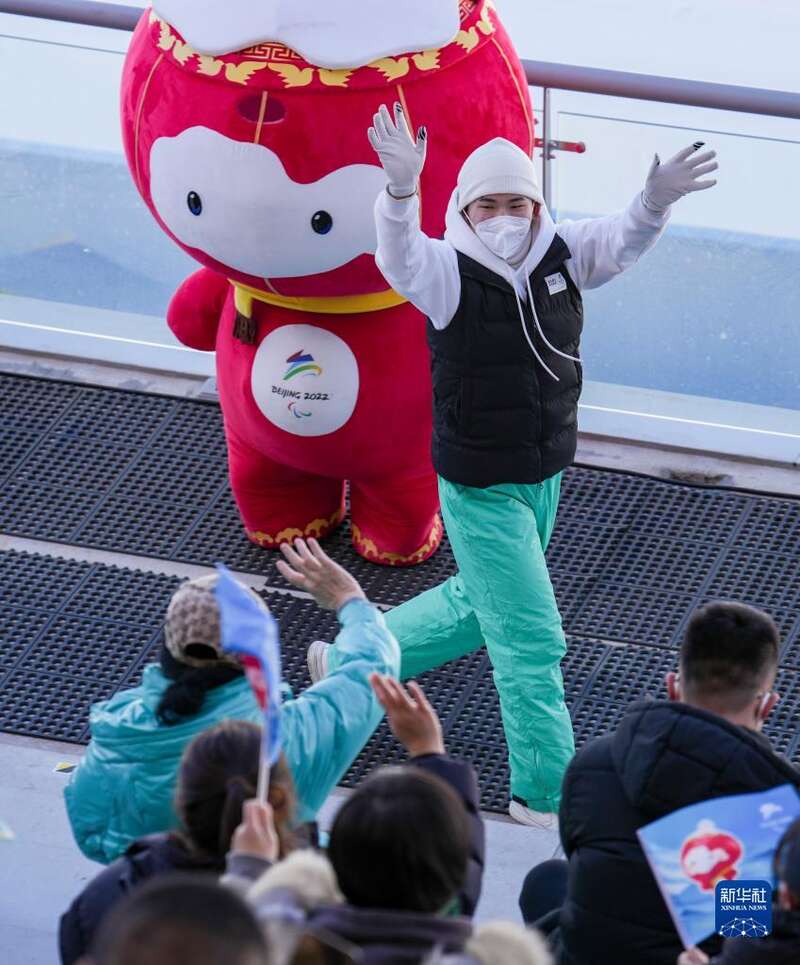在北京2022年冬残奥会赛场国家冬季两项中心,参与表演的学生苏雅力图退场时和观众打招呼(3月8日摄)。
